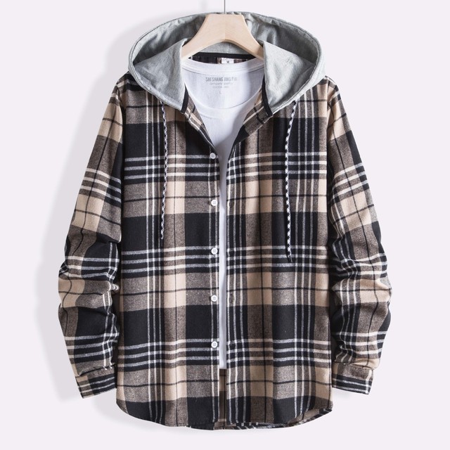 Black White Plaid Shirt Men Shirts Autumn Fashion Hooded Mens Checkered Shirts Long Sleeve Shirt Men Blouse Chemise Homme