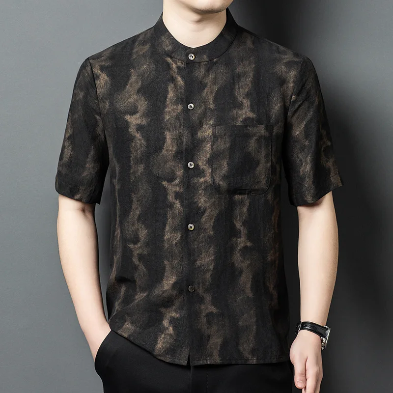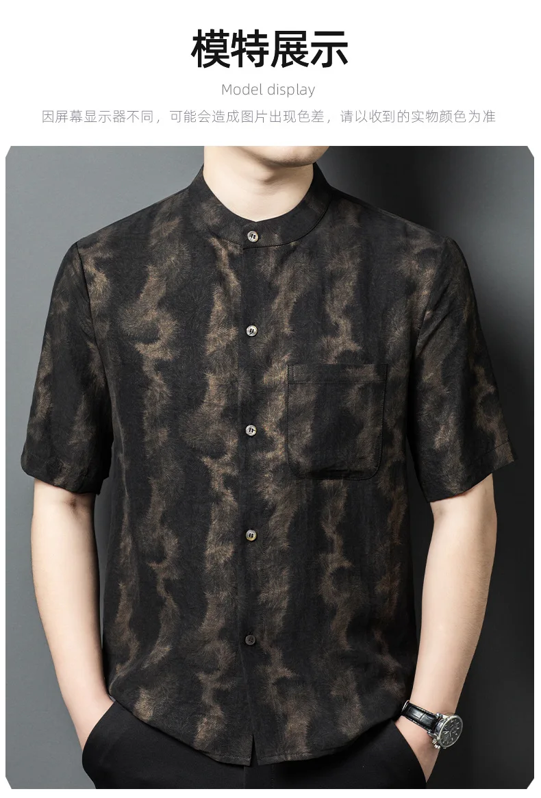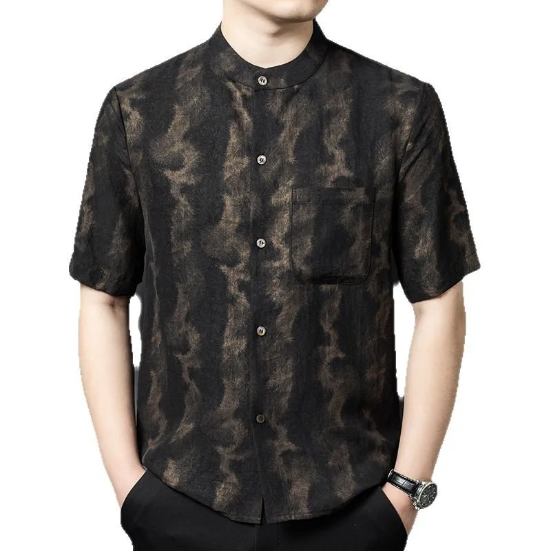 High Quality Real Silk Men’s Gambiered Guangdong Shirt Summer Thin Loose Casual Dad Wear Fashion