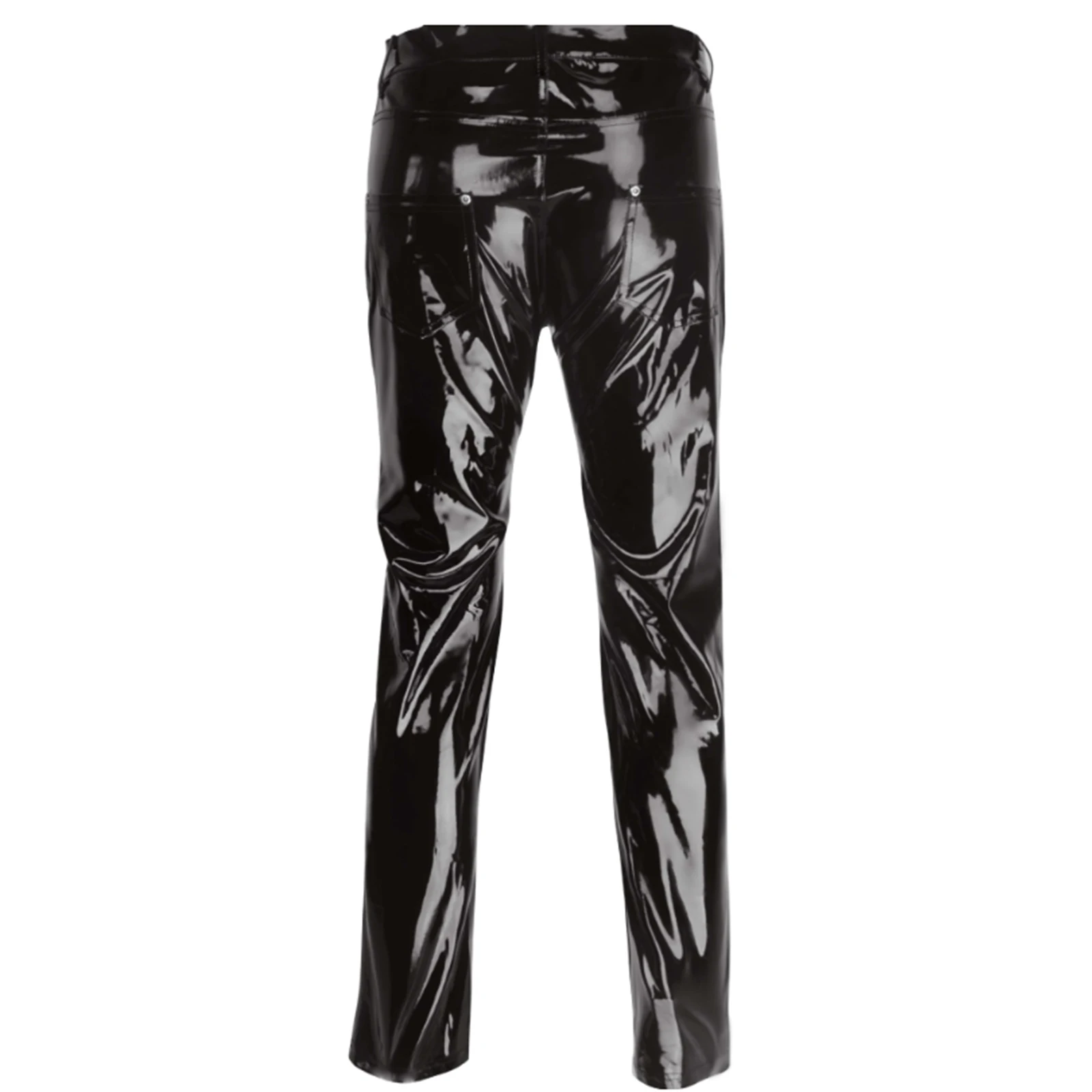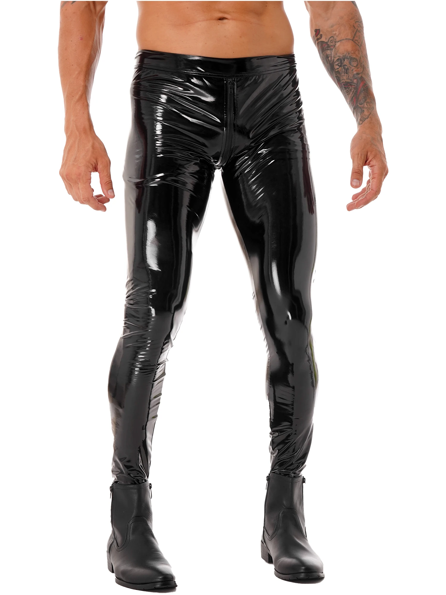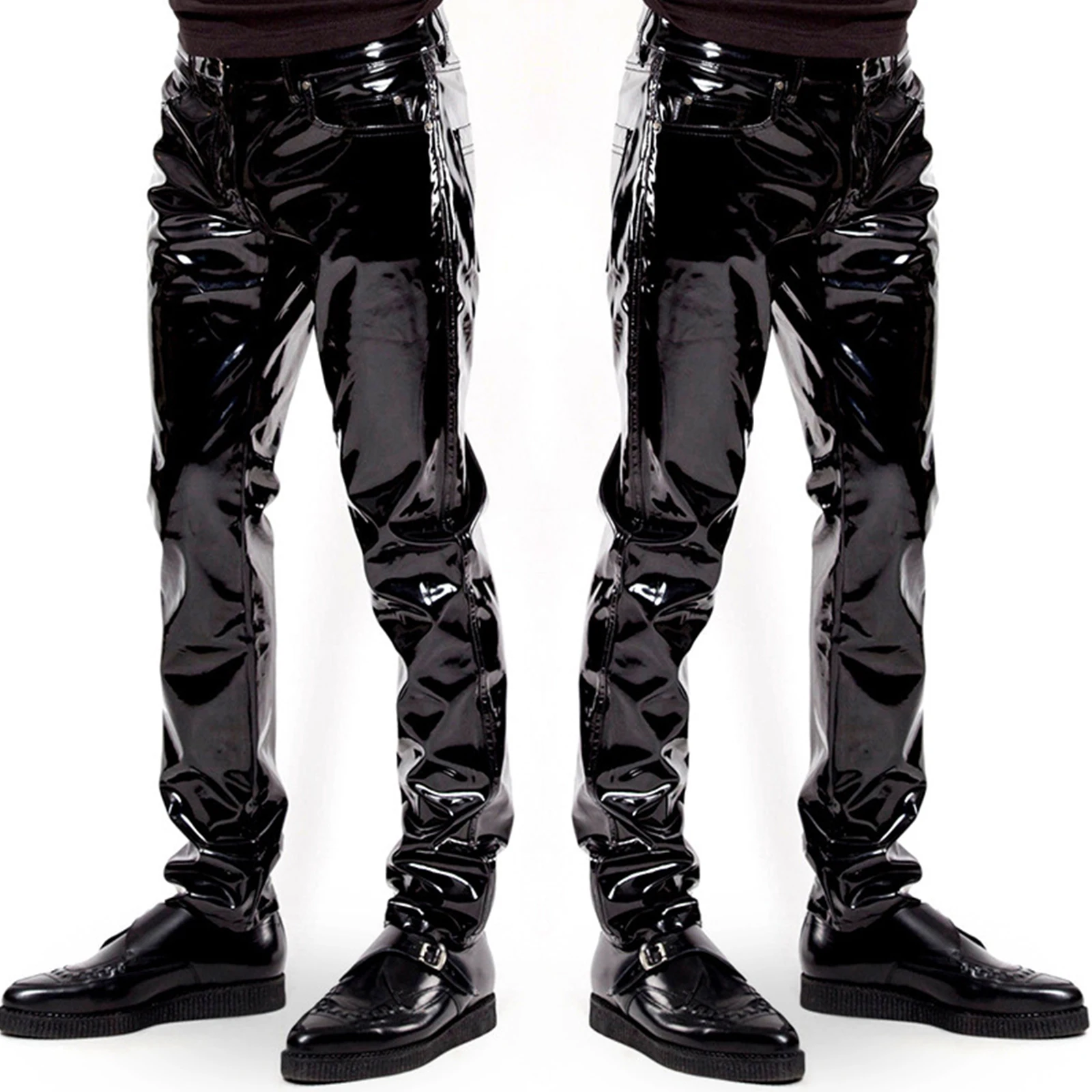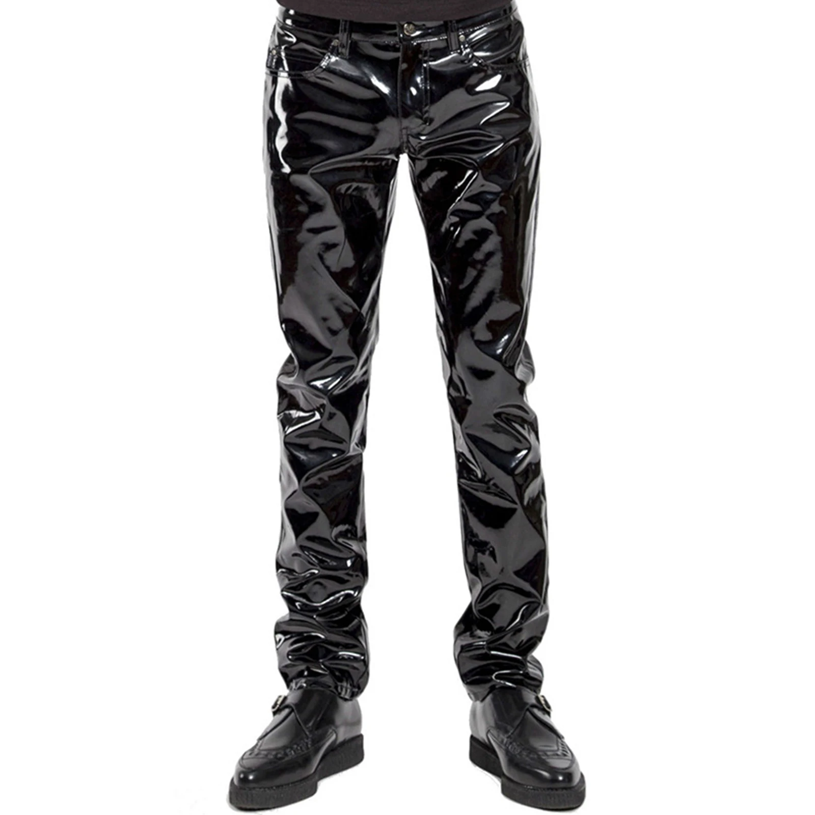 Black Men Latex Leather Pants Low Waist Faux Leather Shiny Pants Fashion Tight Trousers for Club Stage Show Rock Band Performance