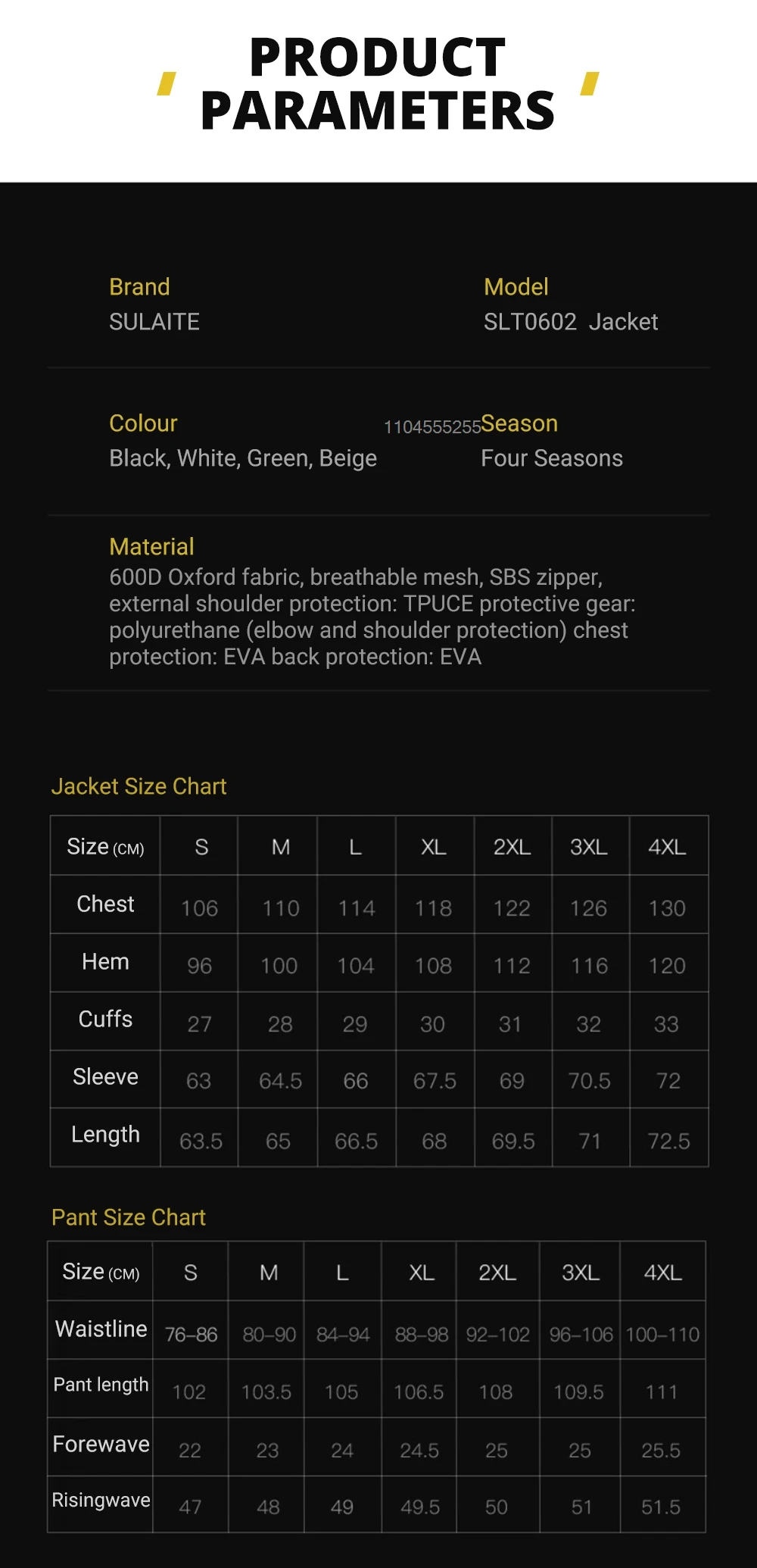Features: Oxford woven/detachable CE protective equipment/detachable chest protection/summer breathable mesh/reflective
