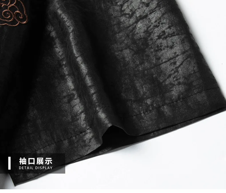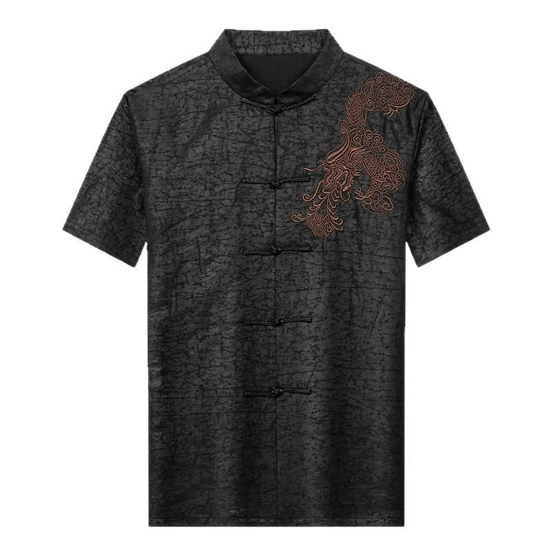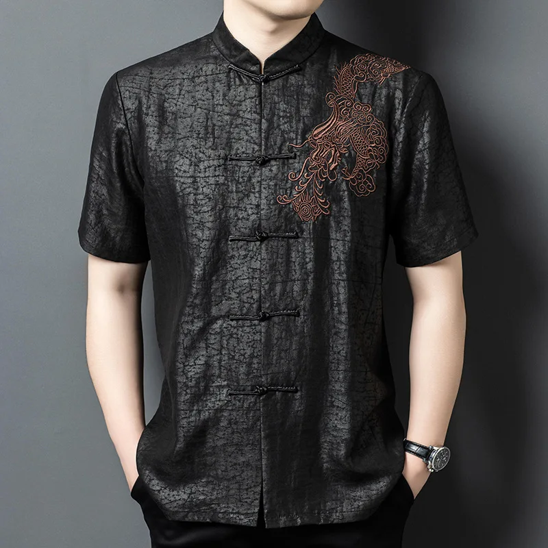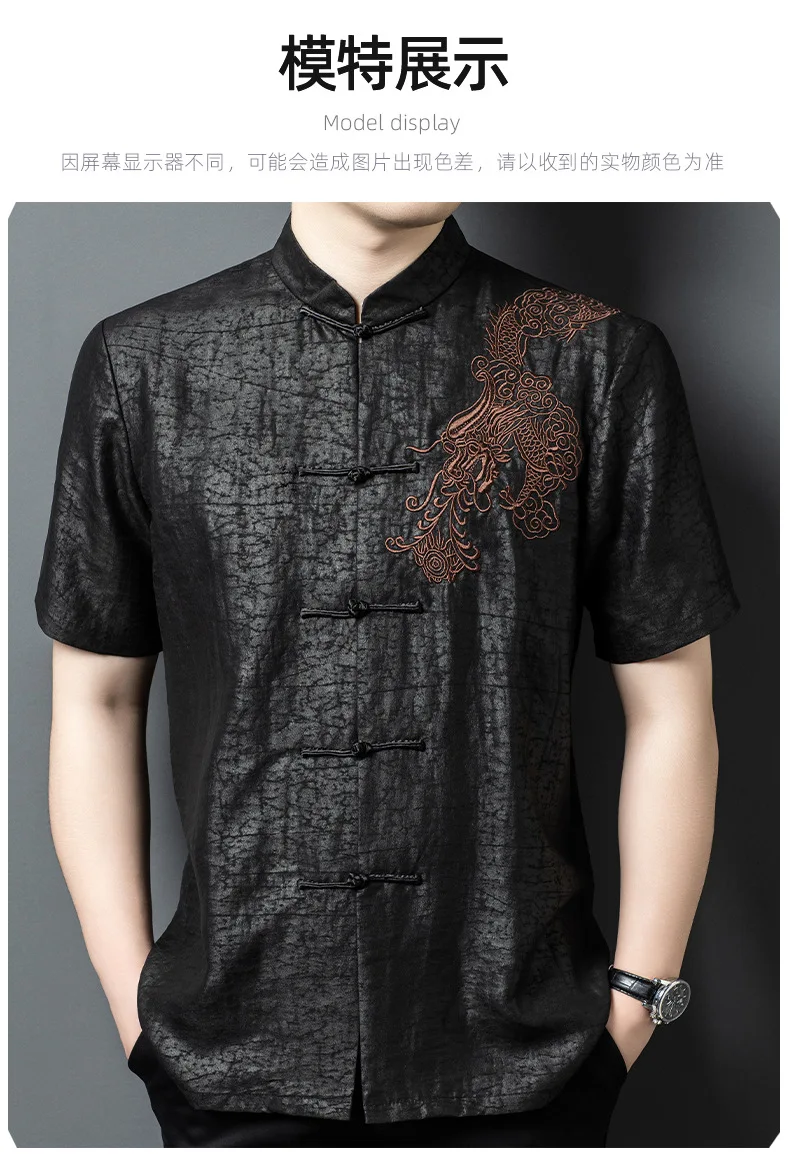 Real Silk Men’s High-End Xiangyun Yarn Short Sleeve Leisure Retro Embroidered Chinese Knot Button Stand Collar Shirt Clothing