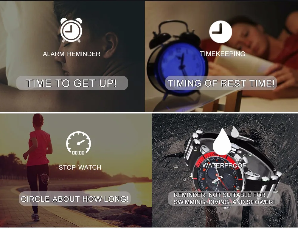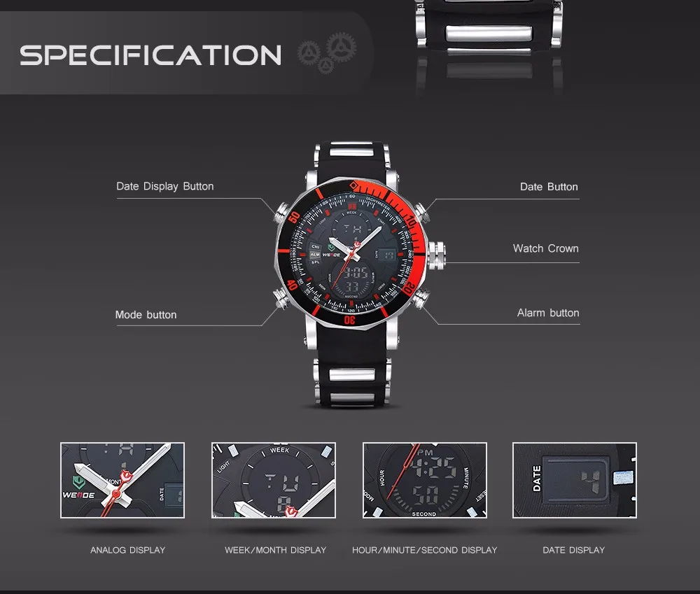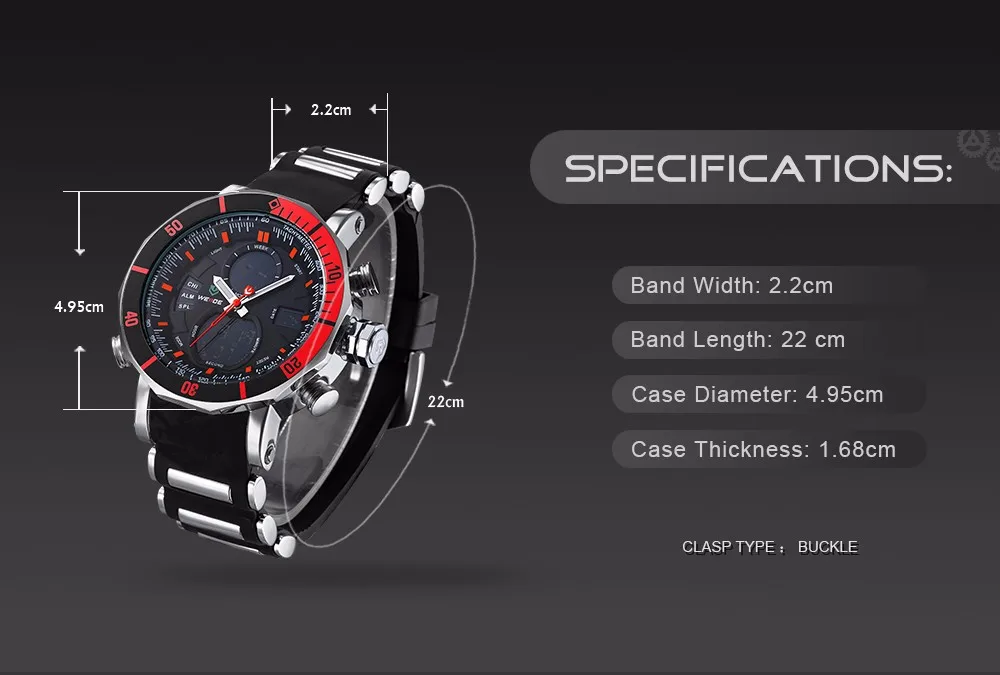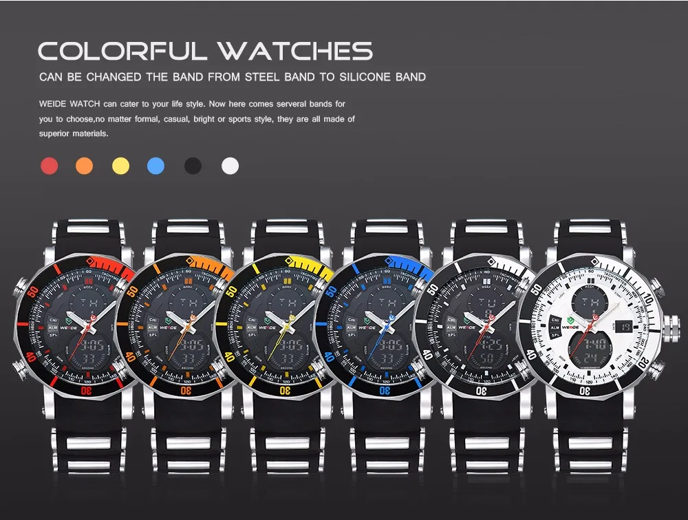 BRAND: WEIDE ITEM: WH5203 STYLE: SPORT,CASUAL,BUSINESS,OUTDOOR DISPLAY: ANALOG-LCD DIGITAL MOVEMENT: LCD YXD-0612B-17 + JAPAN QUARTZ MOVEMENT Feature: – Six Attractive Versions For Options; – Advanced manufacturing technology; – Original Miyota 2035 quartz movement; – Cool & Specially designed big display screen; – Watch Crown With Environmental IPS Bronze Electroplating; – Stainless steel buckle & backcase with 3D WEIDE logo; – Display system of 12 hours or 24 hours; – Time, second, month, date, day, week, alarm, stop watch, backlight function; – 30 Meters Water Resistant (Not suitable for swimming, diving, shower etc., Please Don’t Press Any Keys Underwater) ; – Walking On Error ±45S/M; Operating temperature:-10°C to +50°C – Band Material: Silicone Specification (approximate): Case Diameter: 5.0cm (1.97 inch) approx. Case Thickness: 1.64cm (0.65 inch) approx. Band Length: 21cm (8.27 inch) approx. Band Width: 2.2cm (0.87 inch) approx. Componets Included: -1 x WEIDE Watch -1 x Gift Box -1 x Users’ Manual Warm reminder: latest package is replacing the former package, now the package will be used randomly.