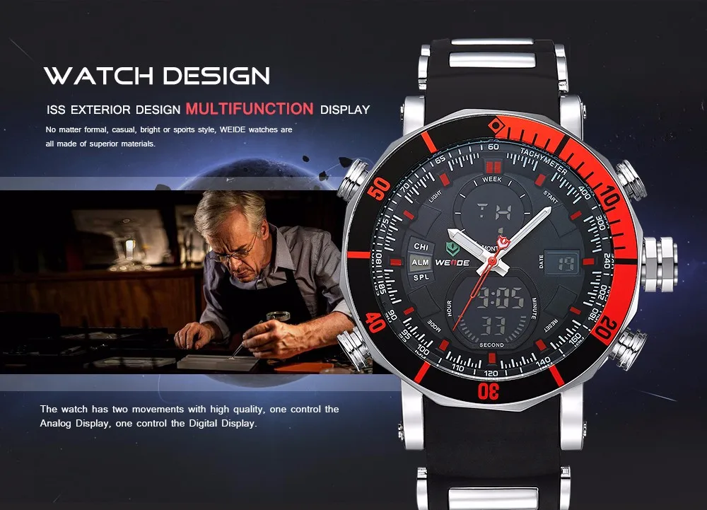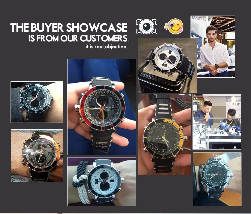 BRAND: WEIDE ITEM: WH5203 STYLE: SPORT,CASUAL,BUSINESS,OUTDOOR DISPLAY: ANALOG-LCD DIGITAL MOVEMENT: LCD YXD-0612B-17 + JAPAN QUARTZ MOVEMENT Feature: – Six Attractive Versions For Options; – Advanced manufacturing technology; – Original Miyota 2035 quartz movement; – Cool & Specially designed big display screen; – Watch Crown With Environmental IPS Bronze Electroplating; – Stainless steel buckle & backcase with 3D WEIDE logo; – Display system of 12 hours or 24 hours; – Time, second, month, date, day, week, alarm, stop watch, backlight function; – 30 Meters Water Resistant (Not suitable for swimming, diving, shower etc., Please Don’t Press Any Keys Underwater) ; – Walking On Error ±45S/M; Operating temperature:-10°C to +50°C – Band Material: Silicone Specification (approximate): Case Diameter: 5.0cm (1.97 inch) approx. Case Thickness: 1.64cm (0.65 inch) approx. Band Length: 21cm (8.27 inch) approx. Band Width: 2.2cm (0.87 inch) approx. Componets Included: -1 x WEIDE Watch -1 x Gift Box -1 x Users’ Manual Warm reminder: latest package is replacing the former package, now the package will be used randomly.